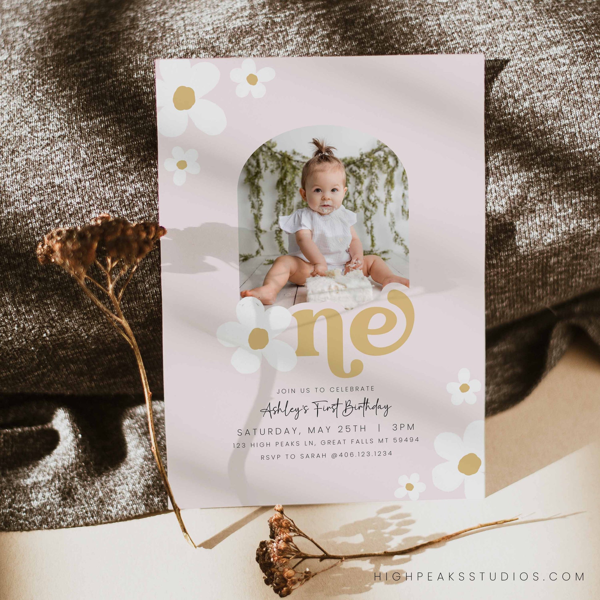 Daisy First Birthday Invitation With Arched Photo