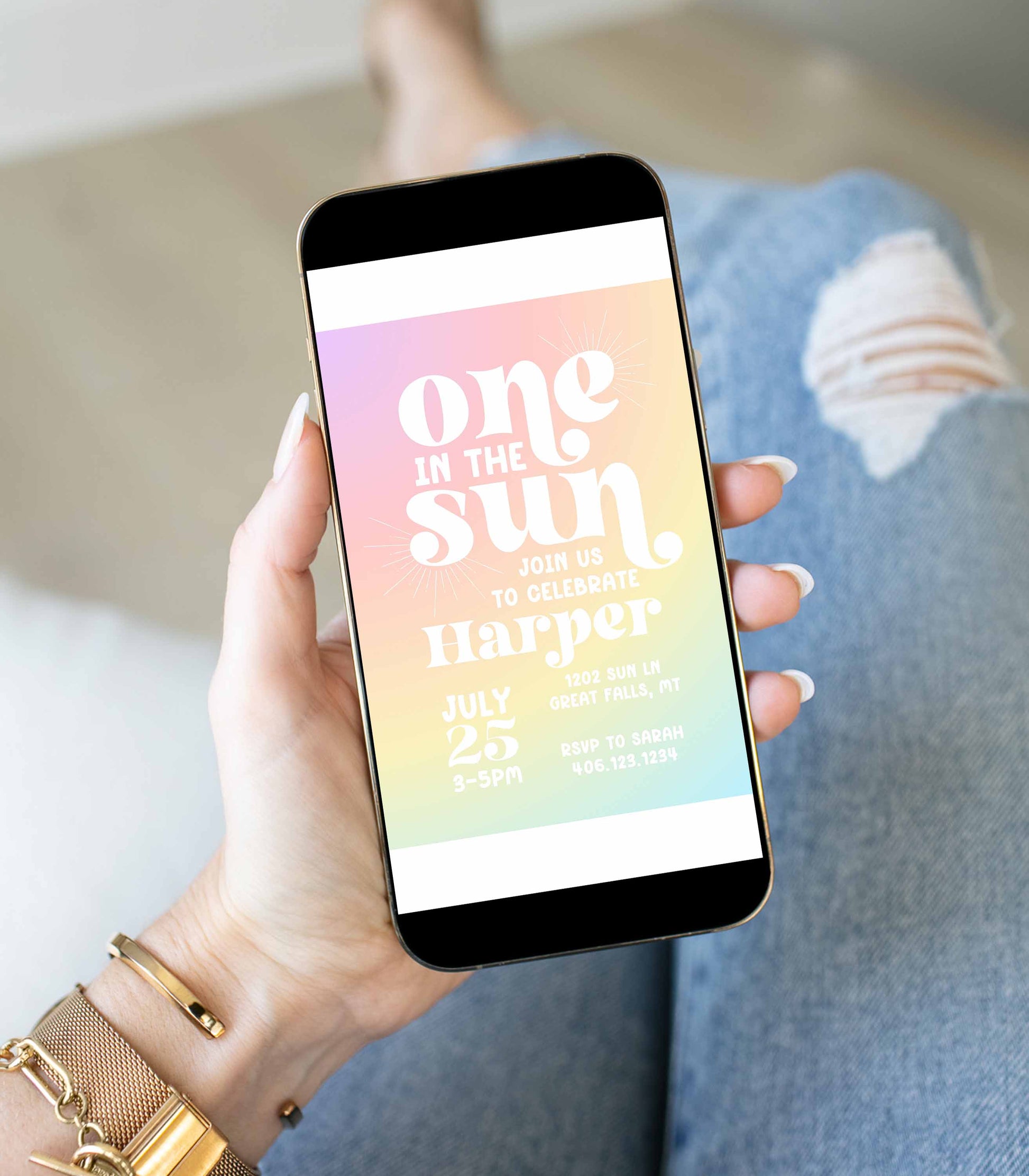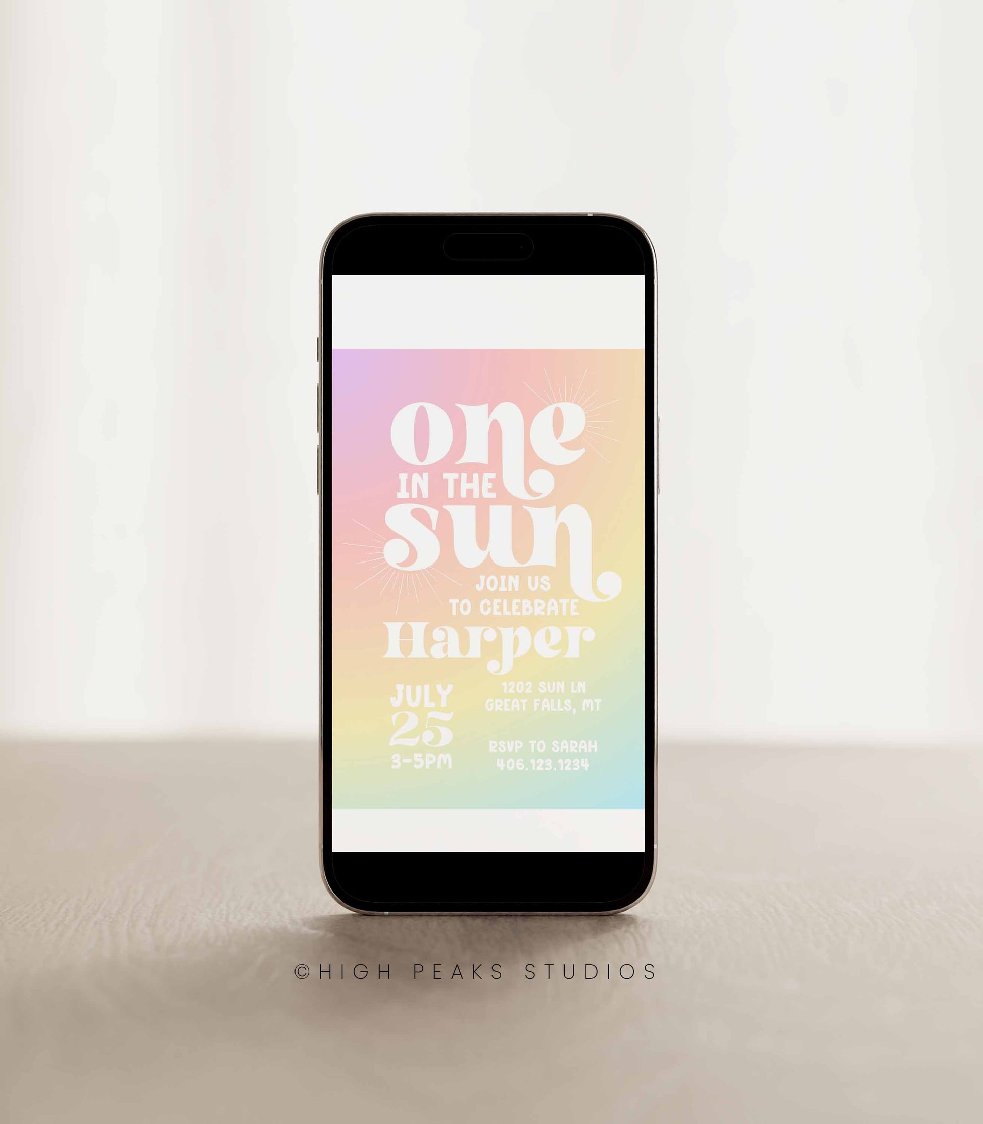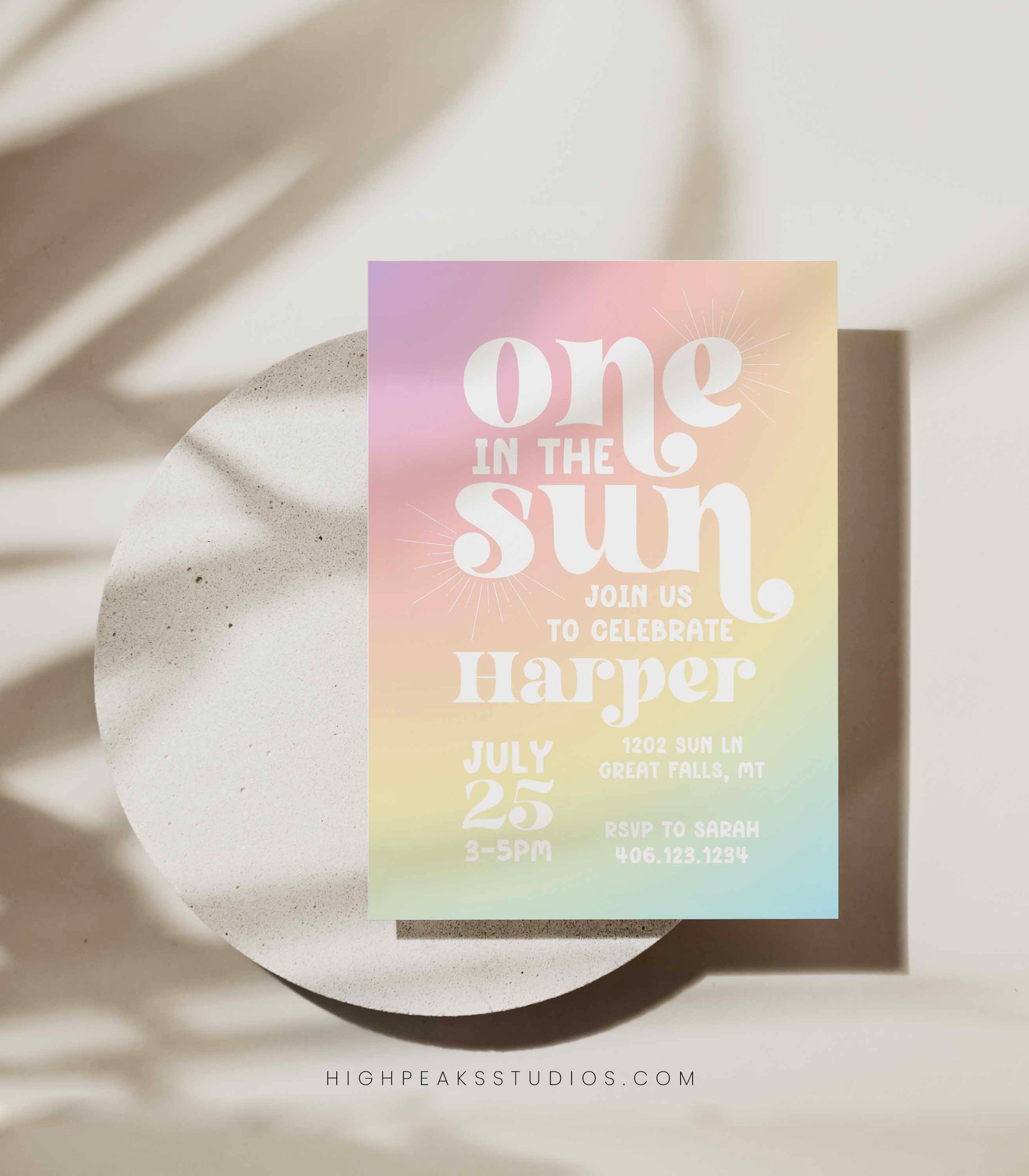 Celebrate your little's birthday with our fun and bright One In The Sun First Birthday Invitation! This editable design features a bright and colorful design with fun fonts and adorable summer pool floats. This invitation is fully customizable in Canva, allowing you to personalize it with your own party details.